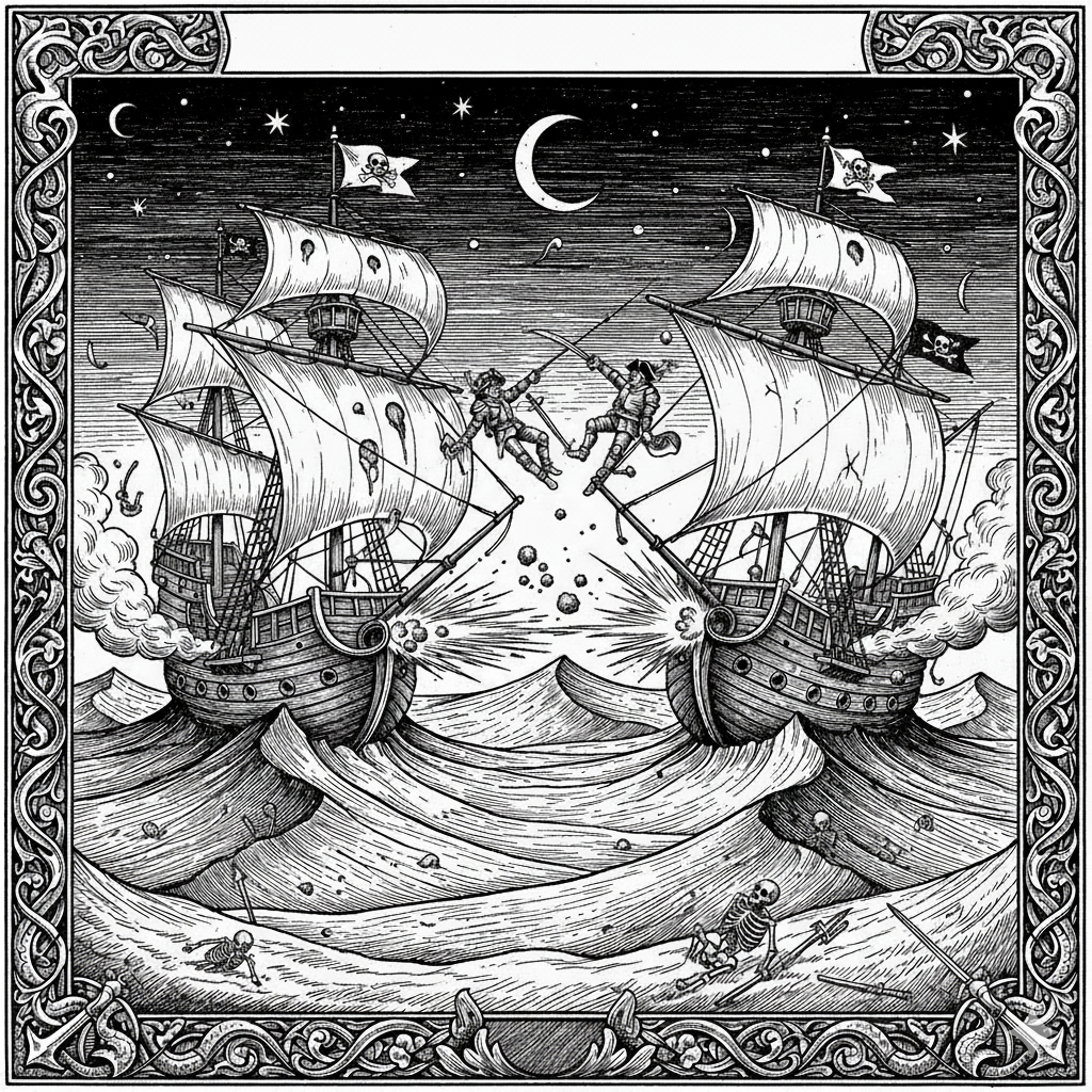 “He’s doing alright by himself,” I replied, as Selladore ducked under a zipping scimitar and with a graceful flourish of his cutlass, severed the offending arm. Then a stray musket ball zipped into his shoulder and knocked him off balance, and a rush of black-clad pirates bore down on him.