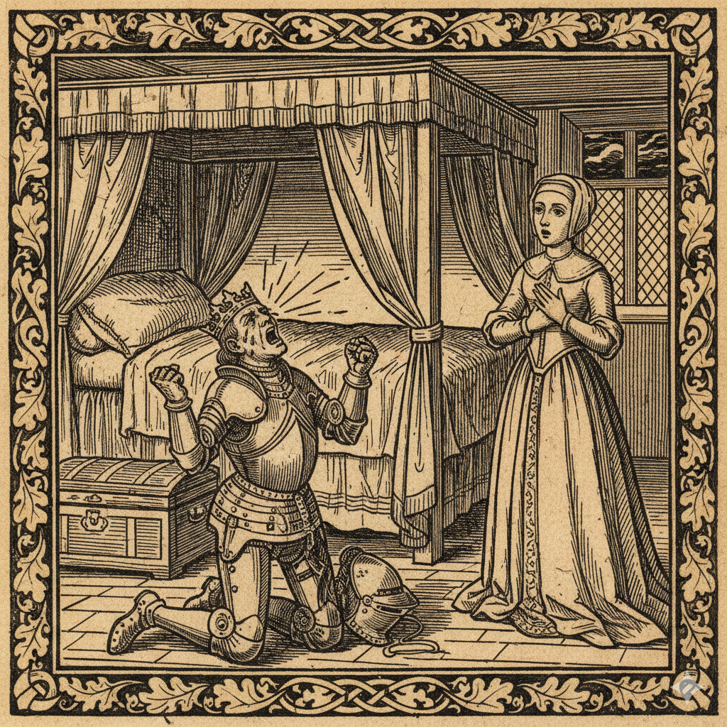 Irritatingly, it didn’t fly off its hinges. It didn’t even splinter. All that happened was I got a hell of a jolt right up my leg and nearly toppled backwards down the stairs. Blast it all, that was my grand entrance neatly bollocksed. With a groan of frustration I grasped the handle, flung open the door and stepped inside the Prince’s bedchambers. And then –